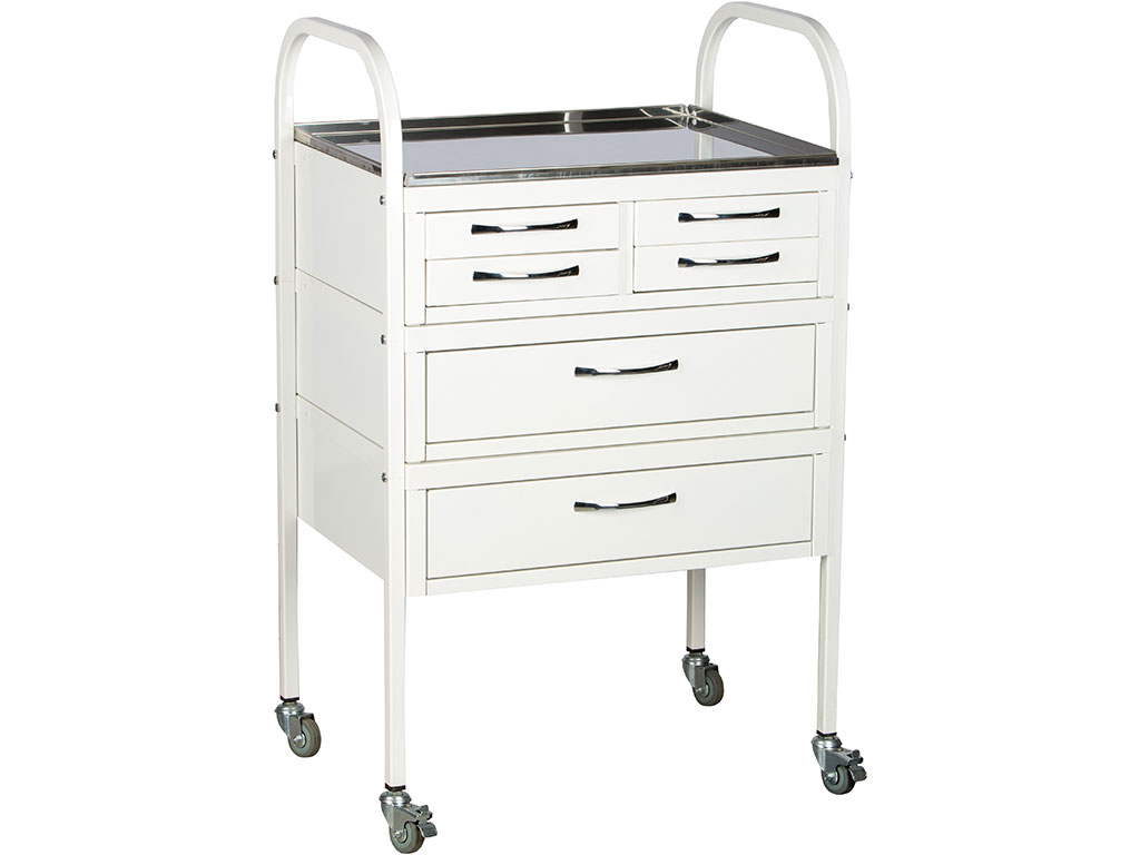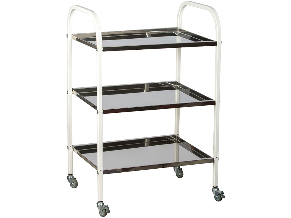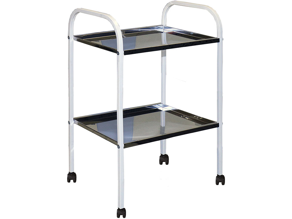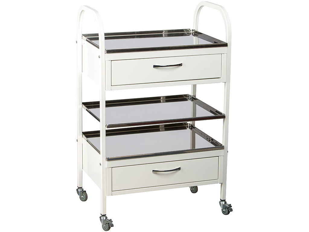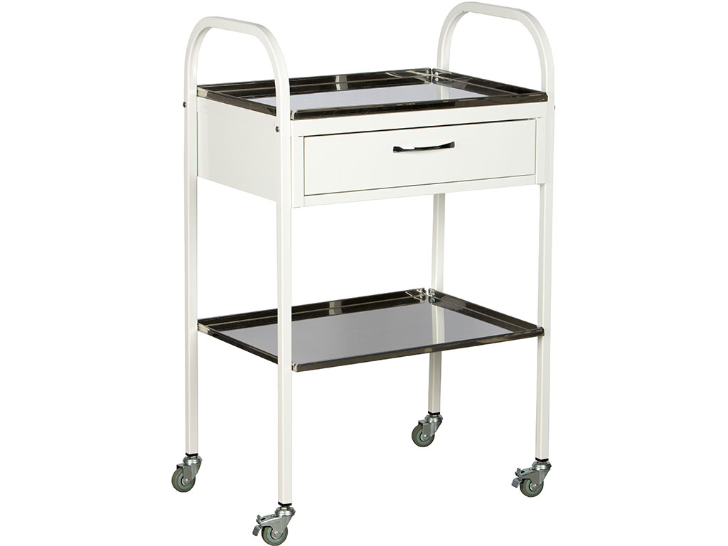 Каркас передвижного медицинского стола изготовлен из профильной трубы квадратного сечения (20х20х1,5 мм), покрытой эпоксидно-порошковой краской. Полки процедурного стола изготовлены из нержавеющей стали толщиной 0,8 мм. Поверхность таких столов устойчива к ударам, сколам, средствам дезинфекционной обработки, что делает их удобными в длительном использовании. Некоторые модели медицинских столиков оснащены ящиками, которые устанавливаются на телескопических направляющих, обеспечивающих плавный и свободный ход с использованием 100% пространства. Ящики оборудованы хромированными ручками и имеют максимальную нагрузку не более 15 кг.